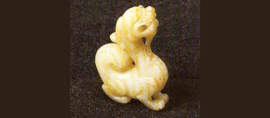 南北朝。白中透黄色,有璺。圆雕,呈蹲踞形。昂首,双角后垂,张口露齿,颔下长须齐胸,细颈,挺胸,身有双翼,长尾上卷,前足伸出,后足曲踞。两颊间横穿一孔,穿系佩带。琢工朴实细致,形象生动威严。《汉书. 西域传》孟康注:“一角者或为天鹿,两角者或为辟邪。”辟邪可除群凶,被称为神兽。现藏中国历史博物馆。