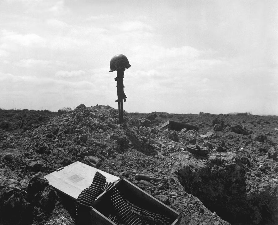 △ 1944年6月,被炮弹炸毁的诺曼第海岸上,为阵亡士兵立下了纪念碑。