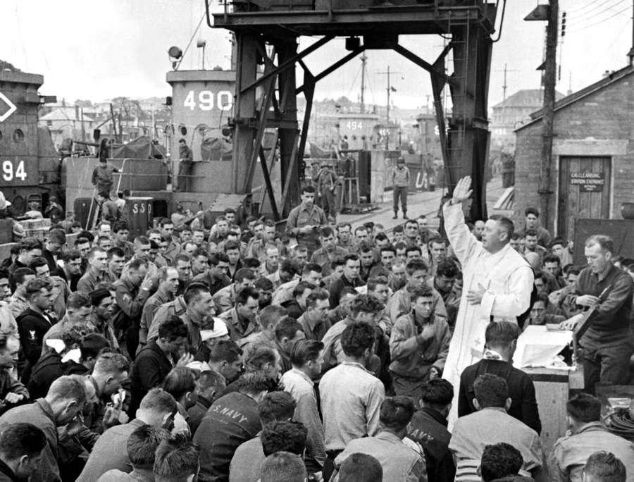 △ 1944年6月6日,在英国威茅斯Weymouth,来自纽约的天主教牧师沃特斯神父(Father Edward J. Waters少校)在码头上主持礼拜仪式,周围是登陆诺曼地的部队成员。