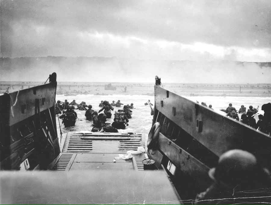 △ 1944年6月6日,在法国诺曼地,美国士兵从奥马哈海滩的登陆艇登陆上岸。