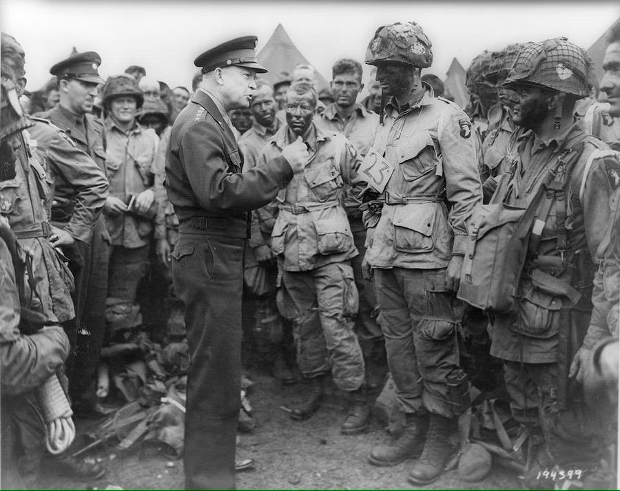 △ 1944年6月5日,盟军最高指挥官艾森豪将军(General Dwight D. Eisenhower)在英格兰格林汉姆公地机场(Greenham Common Airfield)与美国陆军第101空降师第502伞兵团E连的伞兵交谈。