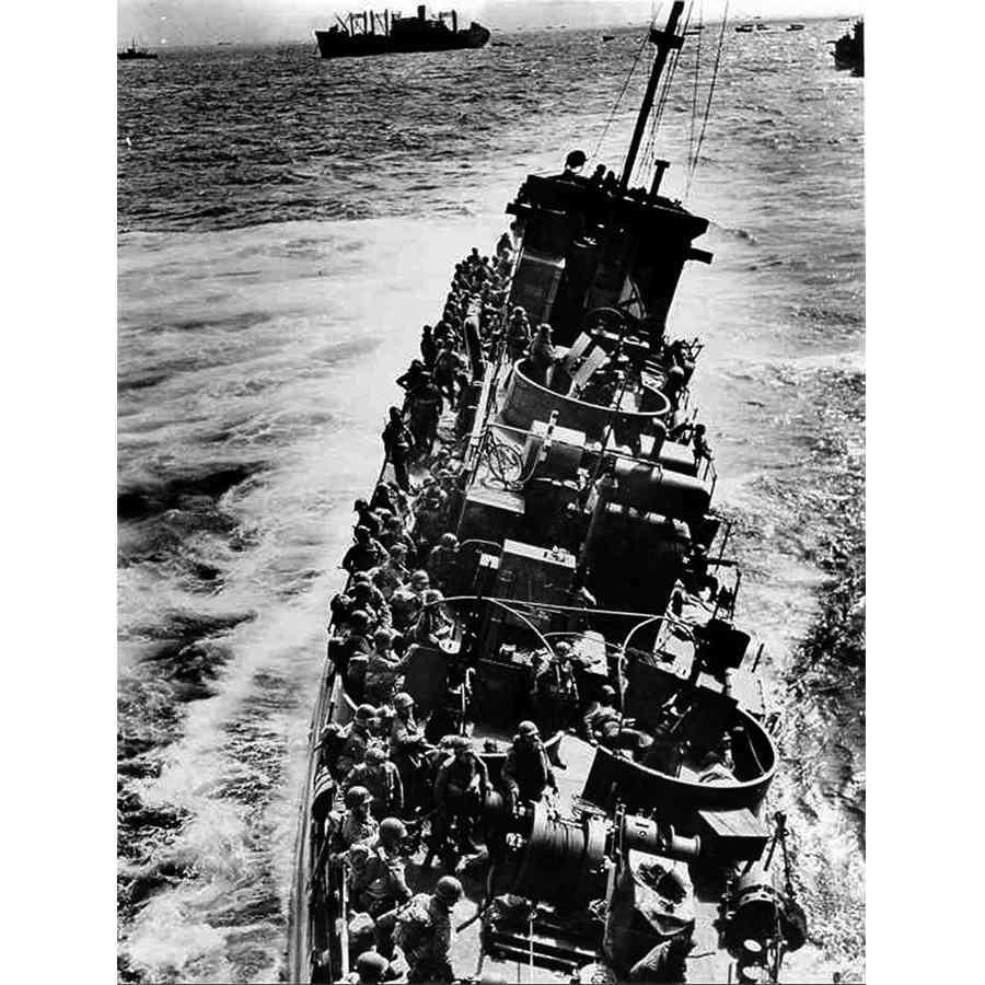△ 1944年6月5日晚,美国战士登上一艘由海岸警卫队驾驶的LCI,正要前往诺曼第登陆。