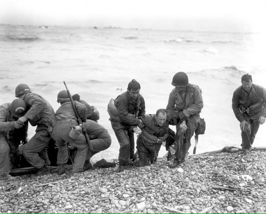 △ 1944年6月6日,美国登陆队成员在法国科勒维尔附近的奥马哈海滩,协助登陆艇被敌军炮火击沉的队友。