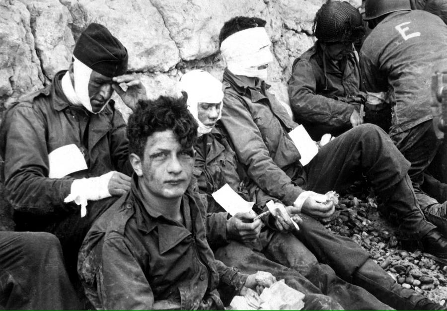 △ 1944年6月6日,在法国诺曼第科勒维尔(Collville-sur-Mer)的奥马哈海滩(Omaha Beach),一些美国第16步兵团突击队员在抢滩登陆时负伤,在白垩悬崖边等待后撤到战地医院接受进一步治疗。