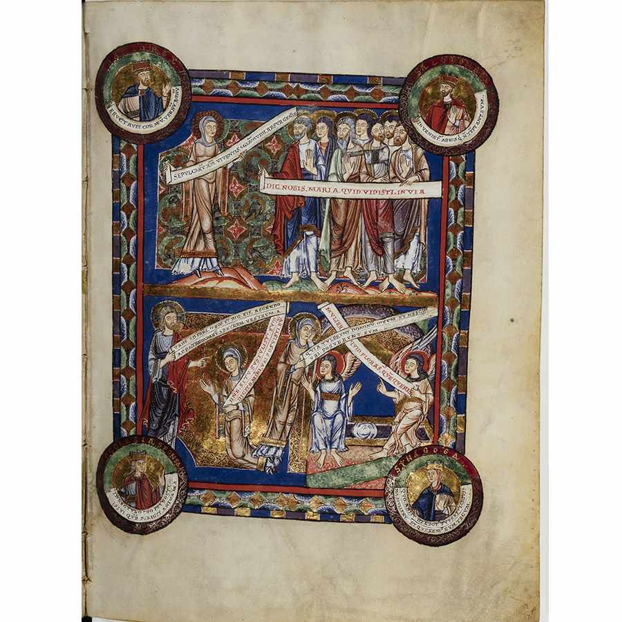 △《舍博恩彌撒書》(Sherborne Missal)——這是一部15世紀泥金裝飾手抄本,以其精美的繪畫和規模而著稱,全書共347張牛皮紙書頁,重達20公斤。該書於1399年至1407年間,為英格蘭多塞特郡的聖瑪麗修道院(St. Mary's Abbey)創作,全書有數千幅繪圖,其裝飾華麗,堪稱中世紀最精美的聖典之一。1998年,大英圖書館以2,121萬美元的價格購得(約今3,650萬美元)。