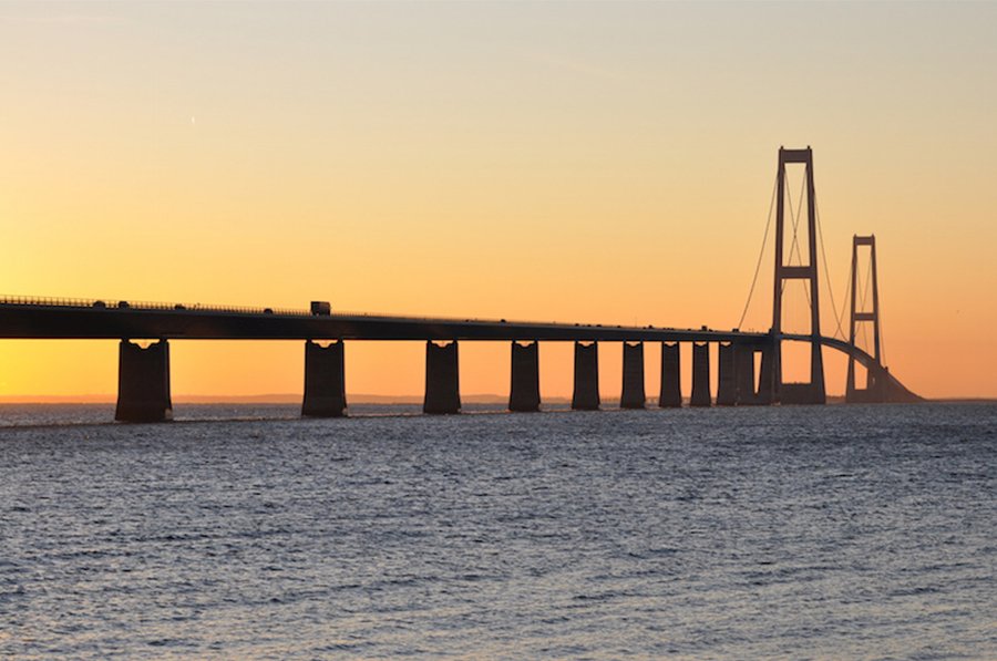 △ 大貝爾特橋(Great Belt Bridge)︰大貝爾特橋實際上是被斯普羅格島(Sprogø)一分為二的兩座橋——東橋和西橋。東橋是一座長1,624米(5,328英尺)的懸索橋,橫跨西蘭島(Zealand)和斯普羅格島之間的斯托貝爾特(Storebælt)最深處。它擁有世界第三長的主跨度。東橋海拔254米(833 英尺),兩座橋塔是丹麥的最高點。西橋是一座長6,611米(21,689英尺)的鐵路和公路混合橋,連接斯普羅格島和菲英島(Funen)。