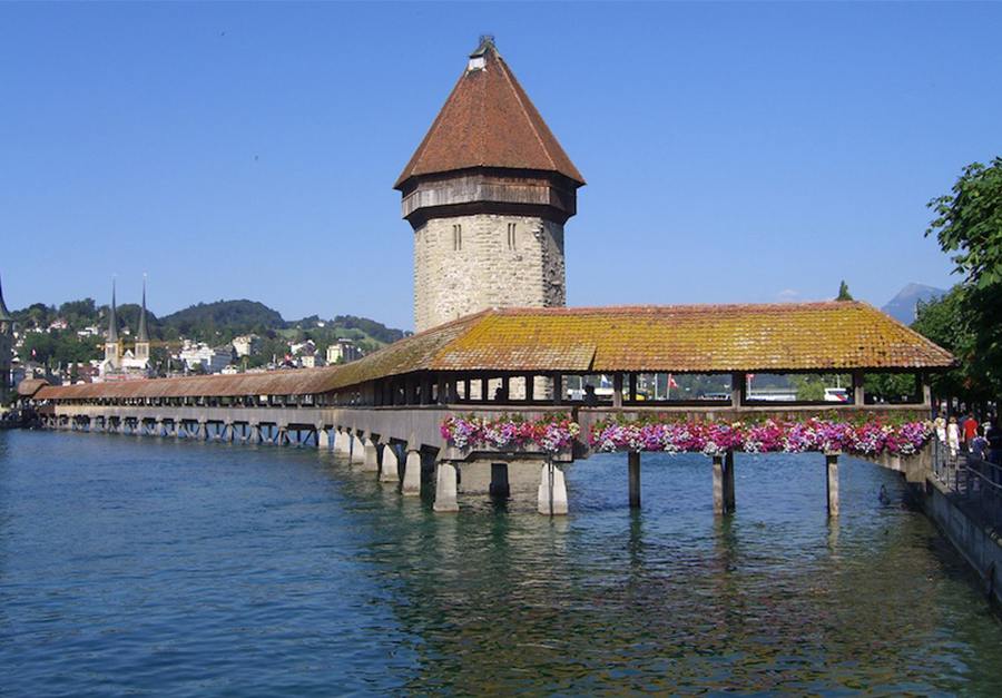△ 卡佩爾橋(Chapel Bridge)︰卡佩爾橋長204米(670 英尺),橫跨瑞士盧塞恩市(Lucerne, Switzerland)的羅伊斯河(Reuss River)。它是歐洲最古老的木製廊橋,也是瑞士的主要旅遊景點之一。這座廊橋建於1333年,旨在保護盧塞恩市的安全。 橋上有一系列17世紀的繪畫,描繪盧塞恩的歷史事件。這座橋和繪畫大部分在1993年的一場大火中被毀,不過很快就重建了。