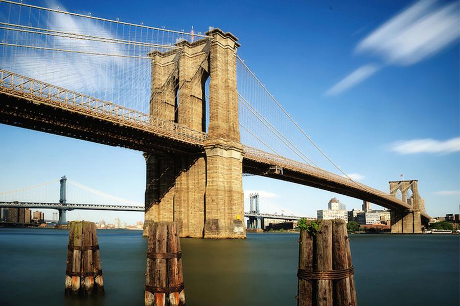 △ 布魯克林大橋(Brooklyn Bridge)︰布魯克林大橋於1883年建成,橫跨東河(East River),連接曼哈頓(Manhattan)和布魯克林。在開通的幾年裡,它是世界上最長的懸索橋,已成為紐約著名的標誌性地標。大橋有一條寬闊的人行道,供行人和騎自行車的人使用。 這條人行道在困難時期具有特殊重要性,例如在2001年9月11日襲擊事件期間,通常的過橋方式無法使用。