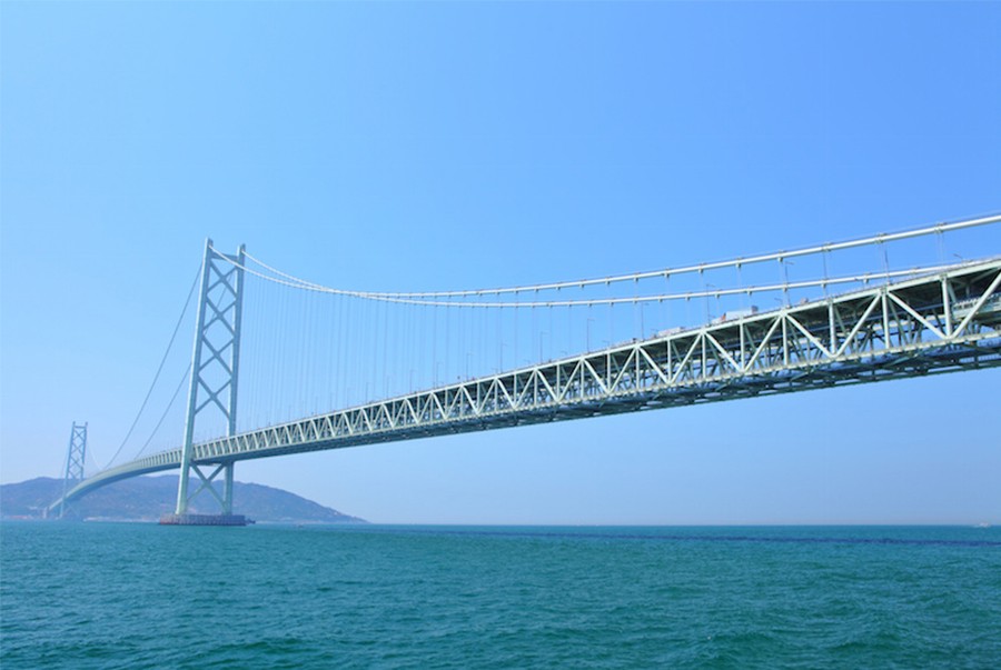 △ 明石海峽大橋(Akashi-Kaikyo Bridge)︰明石海峽大橋又名「珍珠橋」(Pearl Bridge),是世界上最長的索橋,全長1,991米(6,532英尺)。它橫跨日本明石海峽(Akashi Strait),連接日本本土的神戶(Kobe)和淡井島(Awayi Island)的岩屋(Iwaya)。這座橋花了近12年的時間建成,於1998年通車。橋的中心跨距最初只有1,990米,但1995年1月17日的神戶地震導致兩座塔樓移動,因此不得不增加 1 米。