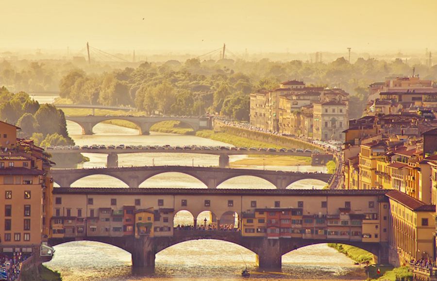 △ 老橋(Ponte Vecchio)︰老橋(字面意思是「古橋」)是一座橫跨佛羅倫斯(Florence)阿諾河(Arno River)的中世紀橋梁,也是二戰後佛羅倫斯唯一一座倖存的橋梁。這座橋以沿岸仍建有商店而聞名,這在美第奇家族(the Medici)時代很常見。最初,屠夫佔據了這些商店;現在的租戶是珠寶商、藝術品經銷商和紀念品銷售商。