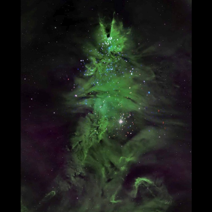 這幅NGC 2264的新圖像結合了錢德拉衛星的X射線資料,和攝影師克勞(Michael Clow)於2024年11月,在美國亞利桑那州使用望遠鏡拍攝的光學圖像。在這張圖片中,形狀像圓錐體的綠色雲看起來像常青樹。星團內的恒星散佈在雲層上,散佈著白、藍、紫、紅的小光點,像似一棵喜慶的宇宙聖誕樹!