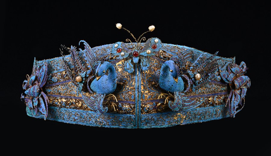 到1850年代,中國人口達到驚人的4.5億,但平均壽命只有40歲。 為了逃離地方的衝突和尋找工作,許多人遷移到城市——上海等國際化中心出現了。雖然許多人的生活極其困難,但有些人卻享有令人難以置信的財富。婦女多半不被官方列入記錄,除非她們因丈夫或兒子的行為而出名。然而,仍有很多東西倖存下來,幫助我們重新想像當時女性生活的世界。例如上圖,這款發帶飾有珍珠、半寶石和亮藍色翠鳥羽毛鑲嵌的點翠。