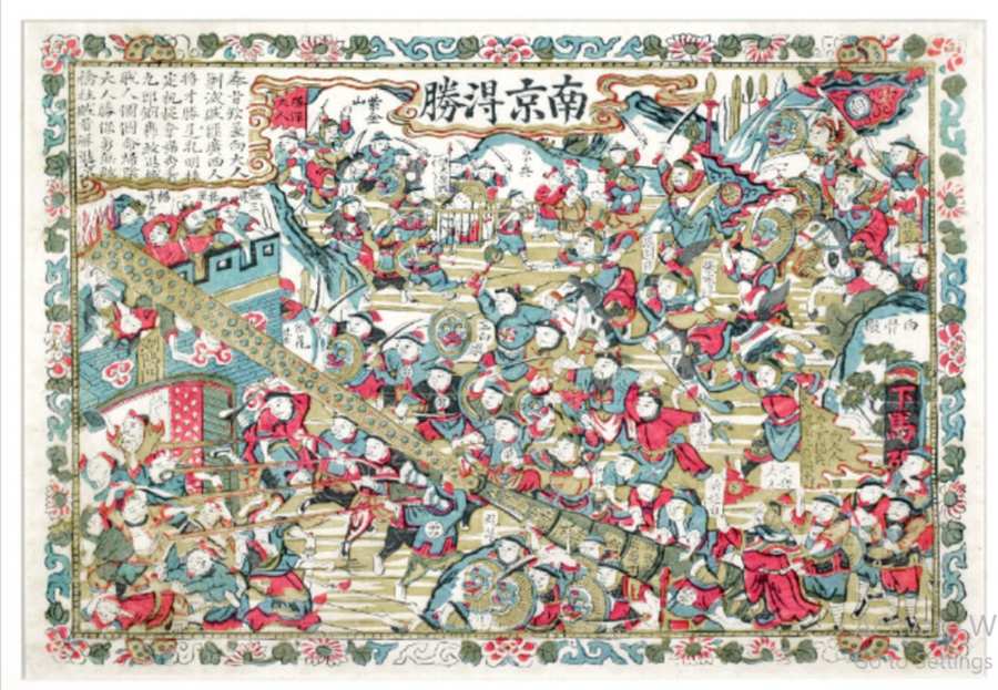 滿清王朝末期,戰事頻發,包括白蓮教起義(1774-1805)、新疆戰爭(1820年代和 1860年代)、太平天國內戰(1850-64)。此外,國際帝國主義帶來了鴉片戰爭(1840-42年和1856-60年)、中法戰爭(1884-85年)、中日戰爭(1894-95年)和義和團運動(1898-1900年)。動盪的局勢加深了緊張局勢、種族疏遠和資源衝突。1912年爆發的民間起義,結束了帝制時代。上圖描繪清朝對太平天國的最終勝利。太平天國是一個在南京建都,並試圖推翻滿清的基督教團體。