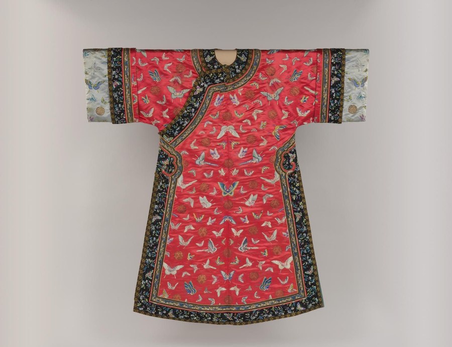1796年至1912年間,滿清政府有6位皇帝先後在位,其中3位是成人即位,之後是3位孩子即位,由慈禧太后攝政。隨著滿族皇室越來越多地採用漢族文化,宮廷人物的形象發生巨大的變化。上圖這件紅袍繡有數十隻代表幸福的蝴蝶、祝願長壽的金色大字,以及寓意春天的梅花邊框。