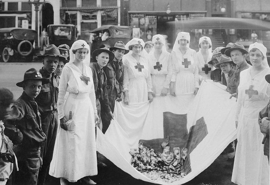 △ 美國紅十字會成員在阿拉巴馬州伯明罕(Birmingham, Alabama)遊行募捐。拍攝時間︰1918年5月21日。