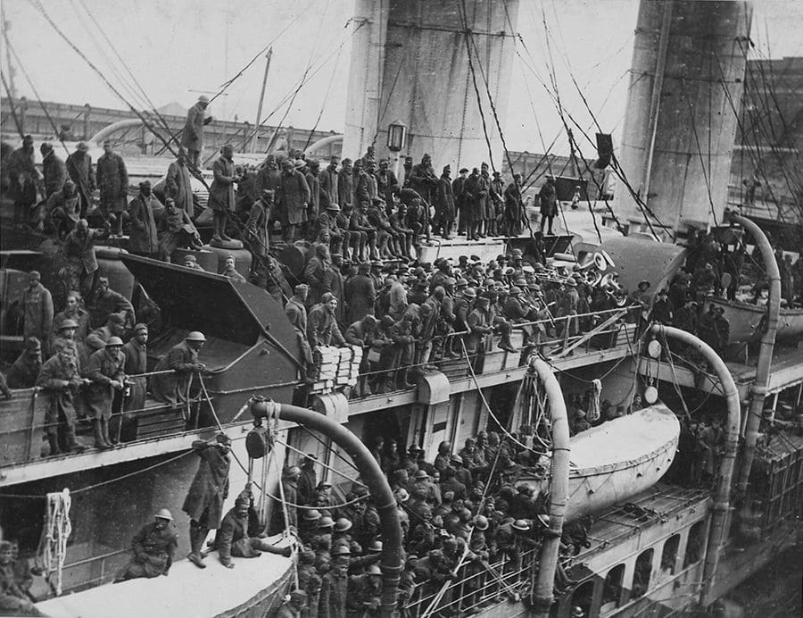 △ 第15步兵團(15th Infantry)戰士帶著戰爭十字勳章(War Crosses),搭乘法國號(La France)返回紐約。這些非裔戰士並未加入美國師或旅,總是和法國部隊一起並肩作戰。