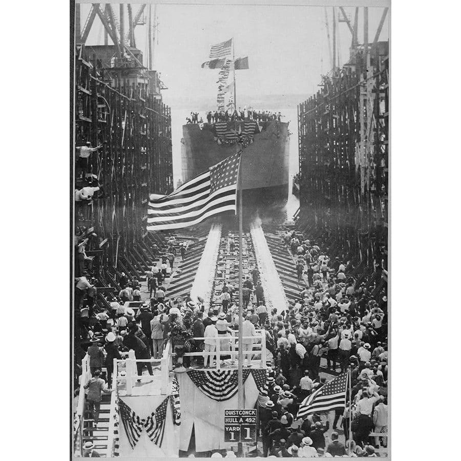 △ 在霍格島造船廠(Hog Island shipyards)首次完成的「奎斯特康克號」(Quistconck)下水。威爾遜總統夫人(Mrs. Wilson)為這艘船命名。拍攝時間︰約1918年。