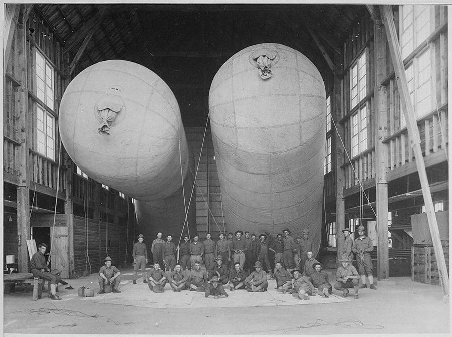 △ 在奧克拉荷馬州西爾堡(Fort Sill, Oklahoma)機庫中的3個5,000立方英呎觀測氣球(Nurse Balloons)。這些觀測氣球的內部充滿氫氣,是用作情報收集和炮兵觀測的空中平臺。拍攝時間︰1918年5月1日。