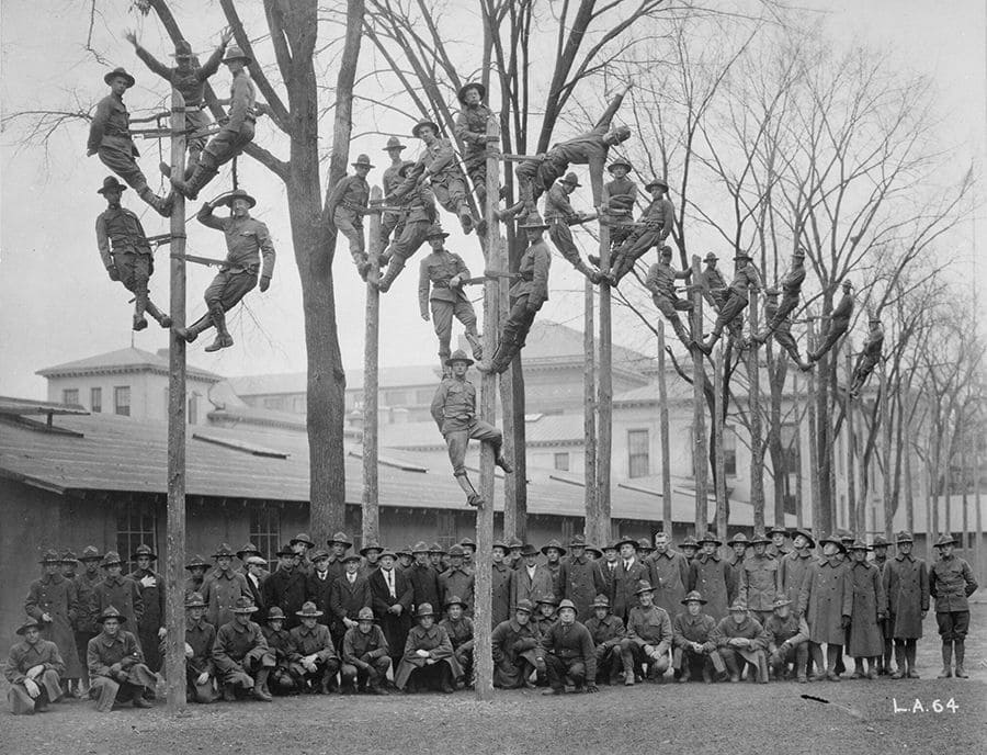 △ 在密西根大學(University of Michigan)安娜堡分校(Ann Arbor)舉辦的職業培訓中,學員們和一些教師們爬上電線杆擺怕。拍攝時間︰約1918年。