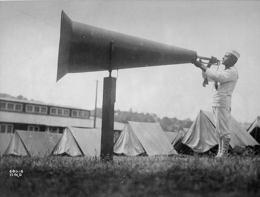 △ 在華盛頓州西雅圖的海軍訓練營,一名衛兵正在吹響起床號。拍攝時間︰約1917至1918年。