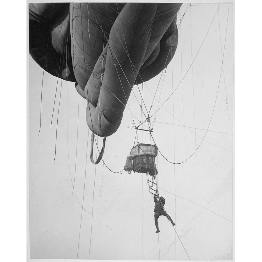△ 一名空中海軍觀察員從「氣球飛船」(U-Boat)上下來,他剛剛完成在大西洋海岸某處的偵察巡航任務。拍攝時間︰約1918年。