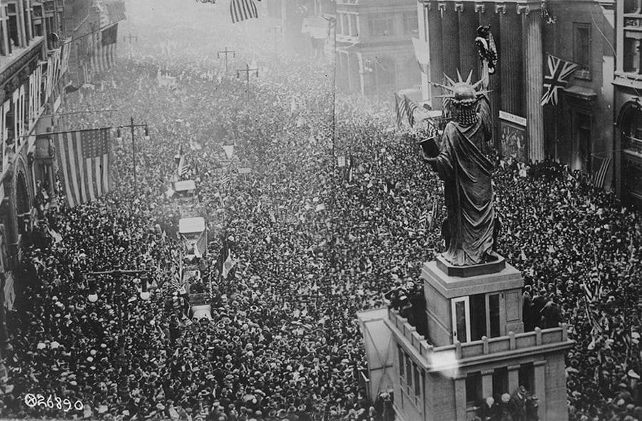 △ 第一次世界大戰在1918年11月11日宣佈停戰,美國賓州費城(Philadelphia, Pennsylvania)為此舉行了盛大的慶祝活動。數千人聚集在費城布羅德街(Broad Street)自由女神像複製品的四周,歡呼不止。
