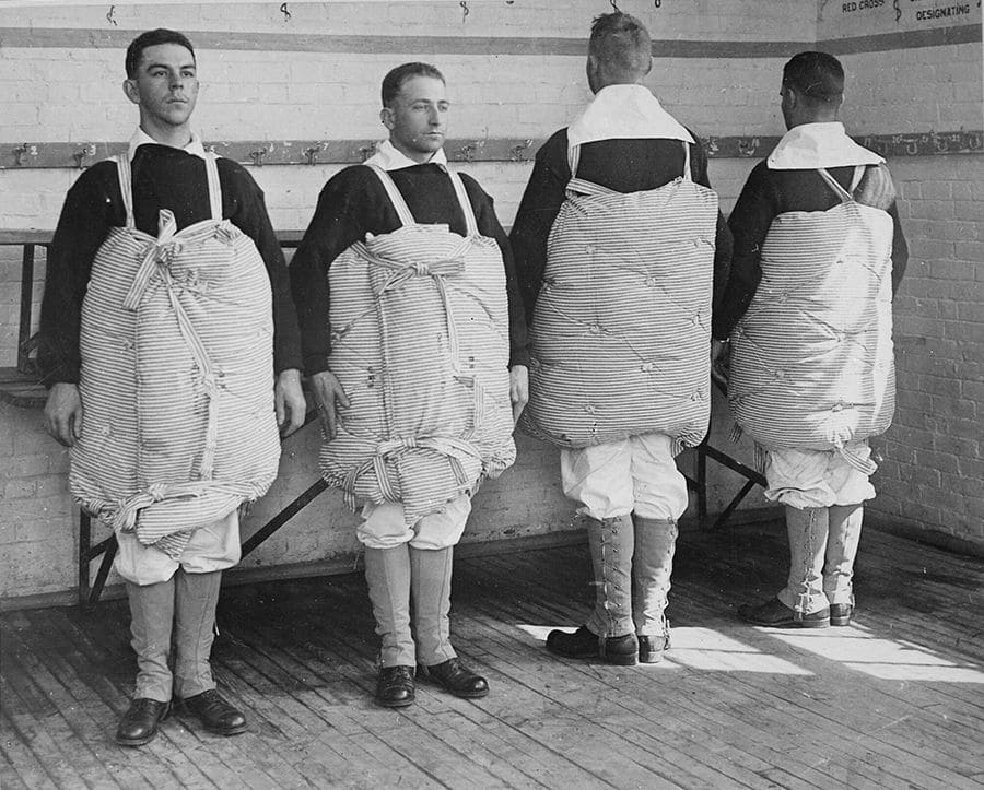 △ 在美國羅德島州(Rhode Island)紐波特海軍訓練站(Newport Naval Training Station),幾名新兵身上綁著床墊當作救生圈。拍攝時間︰1917年4月。