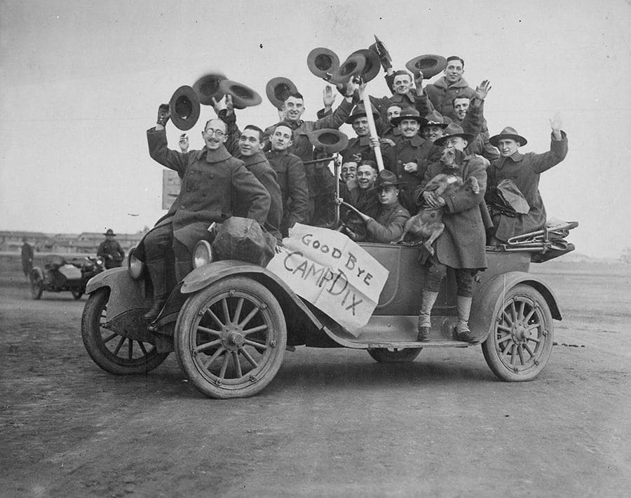 △ 一群從美國新澤西州(New Jersey)迪克斯營(Camp Dix)退伍的士兵高興地合影。拍攝時間︰1918年。