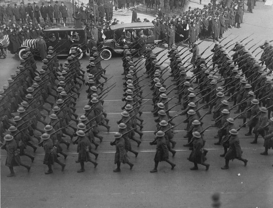 △ 美軍第369步兵團(369th Infantry)在紐約市第五大道(Fifth Avenue, New York)上遊行,接受市民的致敬。拍攝時間︰1919年2月17日。