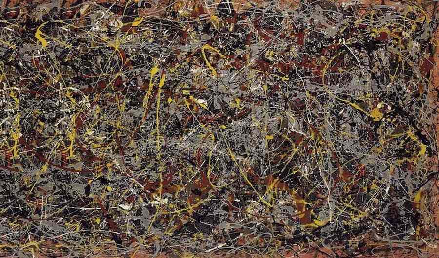 △ 《1948年第5號》(No. 5, 1948):畫家波洛克(Jackson Pollock, 1912 – 1956)沒有使用畫架,而是把作品放在地板上並在它周圍走動,從僵硬的畫筆、棒到掉色的縫衣針。在他的畫作《1948年第5號》完成前一年(1947),他剛剛開始嘗試另一種與眾不同的作畫方式,以至於他後來被暱稱為「滴水者傑克」(Jack the Dripper)。 波洛克的藝術在多方面一直都有創新。儘管他的一些絕妙的想法受到稱讚,但他認為這不過是「出於必要的自然發展」。