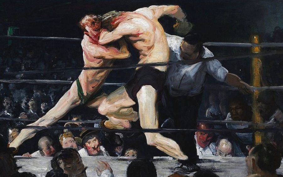 △ 《沙爾基的拳擊台》(Stag at Sharkey’s ):「沙爾基健身房」(Sharkey's Athletic Club)是一家喧鬧的牛仔酒吧,後台裡面還有拳擊台,這對畫家貝洛(George Bellows, 1882 - 1925來說並不意外。該健身房是由曾在美國海軍工作過的沙基(Tom Sailor Sharkey, 1873 – 1953)創立,它吸引想要觀看或參賽的男性。由於當時紐約禁止公開打鬥,因此需要私人活動才能進行打鬥。此畫是在1909年完成的。