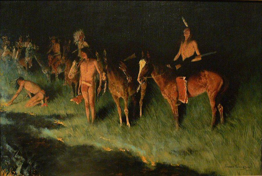 △ 《野火》(The Grass Fire ):在這幅1908年完成的油畫中,畫家雷明頓(Frederic Remington, 1861 - 1909)描繪了一群草原美洲原住民,他們使用一種非常規的方法,放火對付看不見的對手。根據當時的說法,原住民戰士會在對手處於下風的位置時使用這種方法,使燃燒產生的煙霧飄向敵方,阻礙其視線並造成混亂。畫中的黑暗處,似乎在引導觀眾認為其中可能暗藏更多潛伏的戰士。
