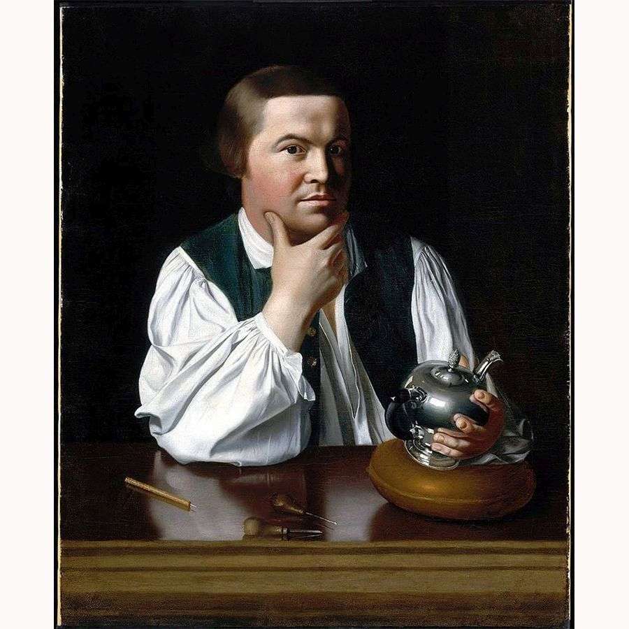 △ 《里維爾的肖像》(Portrait of Paul Revere ):這是畫家科普利(John Singleton Copley, 1738–1815)在1770年的作品。畫正中的里維爾穿著整齊,坐在一張乾淨整潔的桌子後面,右手托著下巴,看著觀眾,就好像他剛抬起頭來似的。手頭的茶壺已經製作好的,但還沒有任何塗飾。據悉,科普利曾畫了一些工匠的畫象,但是請他做肖像畫的顧客一般都是牧師、商人和他們的配偶。