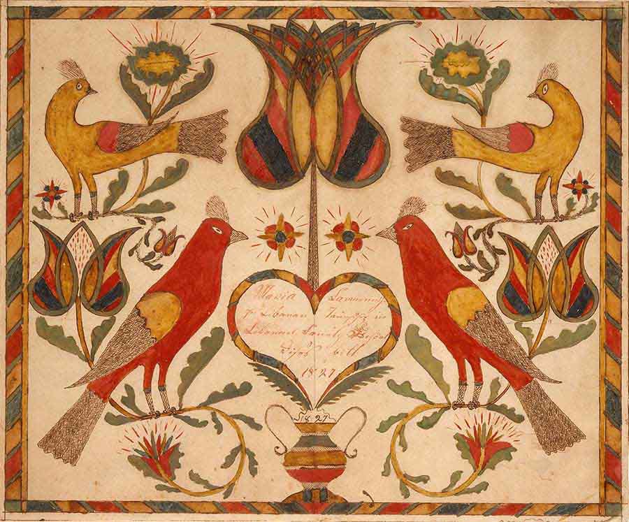 鬱金香圖案在賓州荷蘭人的歷史和傳統中,具有特別重要的意義。由18世紀之交,定居在賓州的新教德國移民及其後代組成的社區,相對與世隔絕,從而形成豐富而獨特的民間藝術和手工藝傳統。賓州荷蘭民間藝術喜歡使用鮮豔的色彩、對稱的設計,因此經常使用鬱金香,它體現了當時流行的審美偏好。賓州荷蘭人的身影出現在木箱、刺繡等各種物品上,尤其是被子和「Fractur字體」最具聲譽。因為它們經常與用來裝飾重要的檔或文件,例如出生或結婚證書,