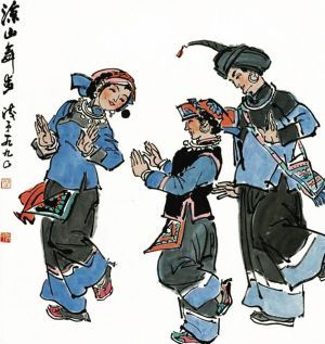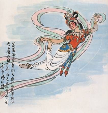 叶浅予,的中国画,主要靠自学,曾一度从张大千。40年代的作品多反映少数民族生活,如《贵州马帮图》、《献花舞》、《苗家姑娘》、《凉山舞步》、《民族大团结》、《夏天》、《头等羊毛》、《北平解放》、《程砚秋在舞台上》、《梅兰芳》、《夏河之秋》、《在内蒙古草原上》等,表明了他善于捕捉富有运动趋向的瞬间舞蹈动作和美的情态。1981年作《长安怀古》组画,以近于漫画的思维和借文物形象,表达了对历史的回顾与评价。张大千曾在叶浅予的《献花舞》中题跋曰:“印度国际大学纪念泰戈尔,诸如生为献花之舞,姿态婉约,艳而不佻,迨所谓天魔舞也耶。其手足皆敷殷红,则缘如来八十种随好手足亦铜色也。观莫高窟北魏人画佛,犹时有亦现此相者。偶见吾友叶浅予作此,漫效之并记。”事实上,张大千对叶浅予此幅激赏有加的原因还在于它暗合中国传统壁画中人物画法。不惜花费数年时间和心血去临摹壁画的张大千,一生醉心于敦煌、莫高窟的壁画艺术,并用自己的画笔加以表现或再现。更深的原因还在于张大千醉心佛门,屡屡造各佛像,以虔诚佛徒自居。而印度本是天竺之今日,为佛教之发祥地,故溯本求源,深相爱慕。所谓“观莫高窟北魏人画佛,犹时有亦现此相者”,即是其谓。叶浅予此幅造像生动,纯任线描,人物神情动作皆宛然如生,衣饰则随之婉转,而设色亦窥中国传统壁画之堂奥,故能深得张大千叹赏。否则,以“五百年来一大千”着称的张大千,必不致私爱如此。