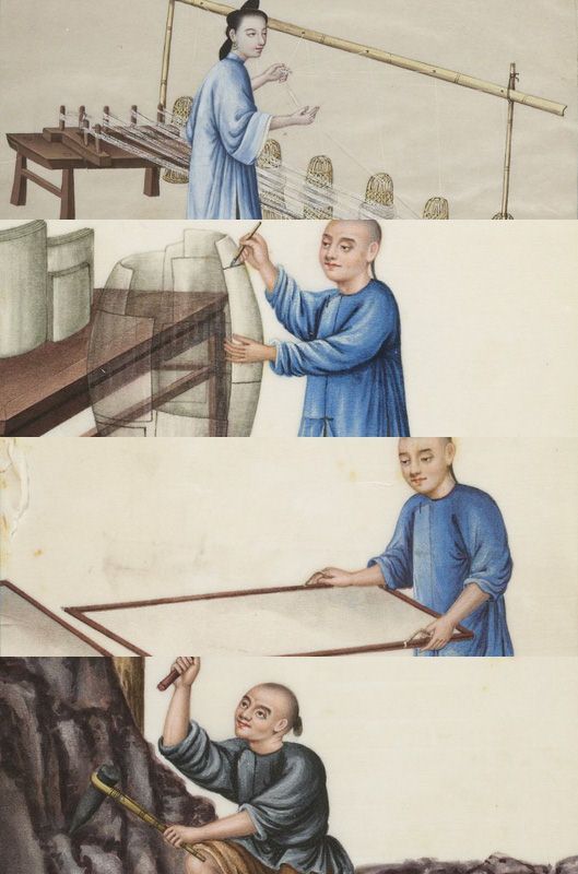2,此套图谱包含四组通草画,分别记录描绘19世纪中国的:棉布纺织、玻璃制造、竹纸制造、煤矿采运
