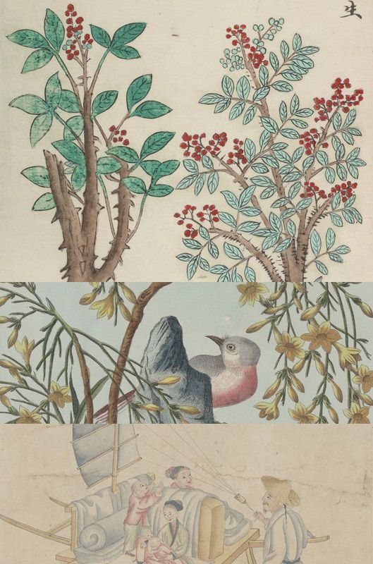 这四组《中国自然历史绘画》包含12本图谱:中国动物图谱、野生植物图谱、通草画(棉布纺织、玻璃制造、竹纸制造、煤矿采运)、中国花鸟图绘、中国制漆图谱、各式炉灶图等等,其中部分动植物图由法国画家Pierre Joseph Buchoz绘制。