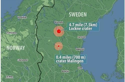 兩 個相距6.6英里(約合16公里)的巨大隕石坑被發現在瑞典地區境內。大的隕石坑有4.7英里(約合7.5公里),被稱為 Lockne 隕石坑,小的被稱為 Malingen 隕石坑,直徑為0.4英里(約合700米)。奧爾默用生物地層學技術分析坑內岩體內的古生物化石,認定二者都在大約4.58億年前產生。