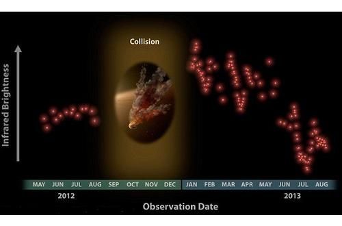 美國宇航局最新研究成果發現,通過 Spitzer 太空望遠鏡觀測到了一個圍繞著新生恆星並且不斷噴發的塵埃。研究人員相信這些塵埃是大型小行星碰撞造成的太空物質,這類型的碰撞最終還會造成新的小行星的誕生。最後研究人員證實了這顆和太陽有一樣3500萬年壽命的大型行星撞擊在名為NGC 2547-ID8的行星上。