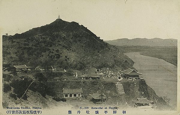 ▲  從南方遠看牡丹峰。半山腰處左有永明寺,右有浮碧樓(Pubyok Pavilion),圖右為大同江。攝於1910年左右。