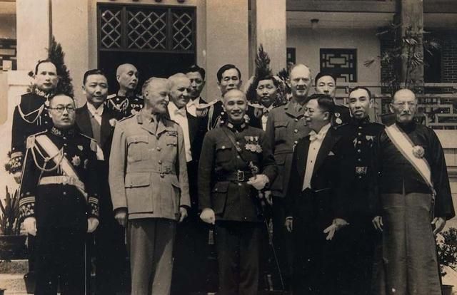 图注:五十年代末,蒋介石、周至柔(左)、唐纵(右后)于台湾省政府门前合影