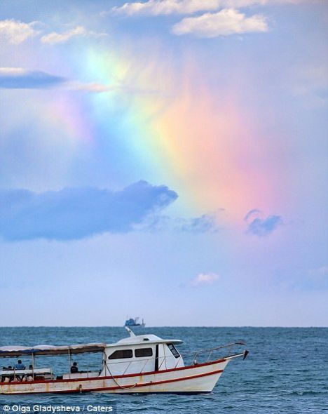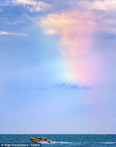 照片的拍摄者是俄罗斯游客奥尔加·格拉迪谢娃(Olga Gladysheva),这张照片是她在泰国普吉岛旅游时拍摄到的,更奇怪的是当时似乎并没有下雨。她个人猜测认为是否可能是海面上蒸腾升起的水汽在空中和太阳光线产生作用,产生了这样的彩虹效果。但是事实上当时普吉岛附近的确在下雨,只是她所在的区域没有下而已。从这个彩虹上方也可以分辨出暗灰色的条带,从下部一直延伸至顶部。