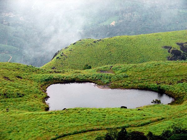 在印度,攀登查姆巴拉峰(Chembra Peak)的途中,可以看到心形的愛神湖(Eros Lake)。