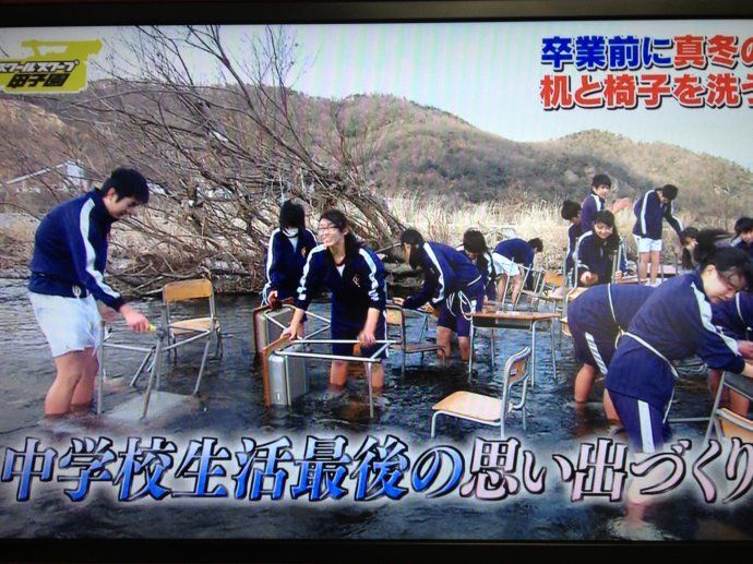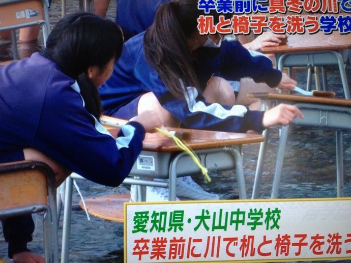 爱知县犬山中学是一所有700多名学生的学校。这一所学校的学生在毕业时,必须做一件事:把自己的课桌椅子扛到学校附近的河川——木曾川上清洗干净,以留给下一届的新生使用。