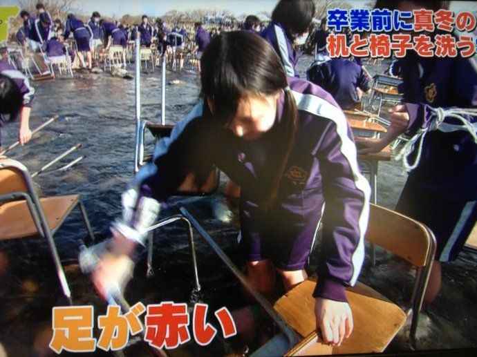 因为日本学校普遍都是3月毕业,而此时的木曾川河,水温只有3-5度,女生们脚都冻红。