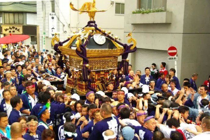 神轿在日本民俗中是神乘坐的轿子,日本各地每年都要举行“祭神”活动,抬着“神轿”巡游一番,祈求神保佑安宁繁荣。