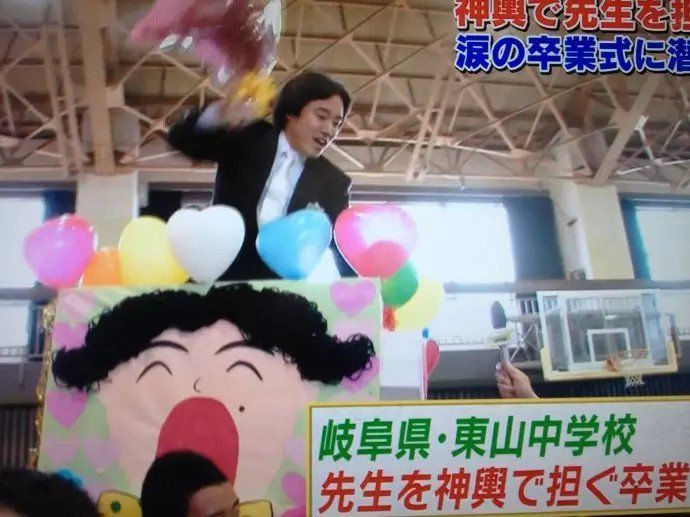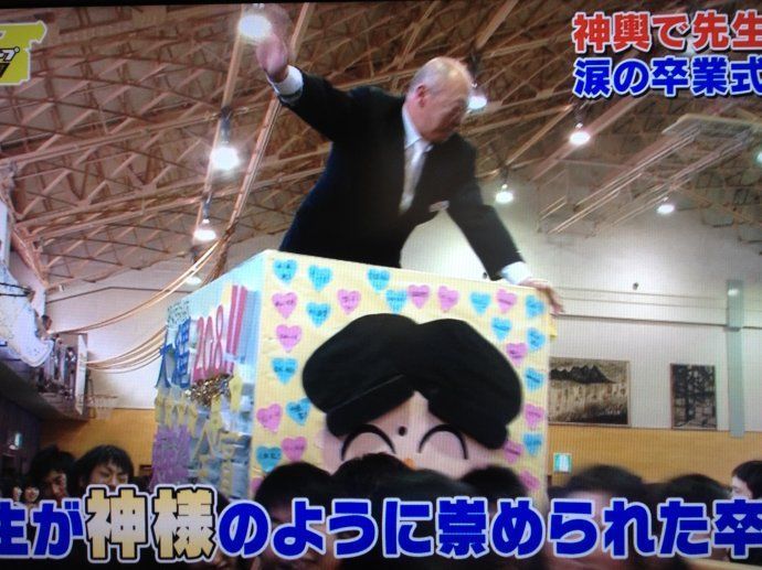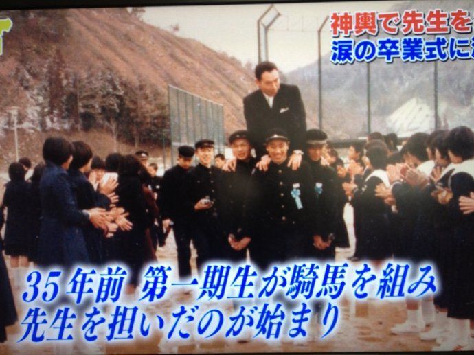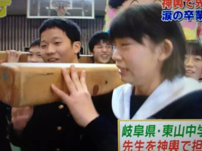 岐阜县东山中学位于世界文化遗产地的高山市附近,有学生400名。这所学校有一个传统,就是学生在毕业时,将老师抬上神轿,载着老师巡游一圈,以感谢师恩。