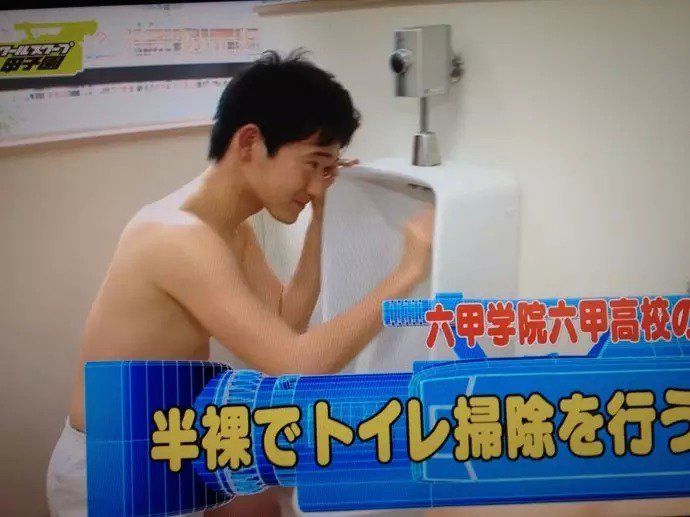 兵库县六甲高中是一所大学升学率奇高的著名私立男子中学。这所学校对于学生有着相当严格的要求,每天不管刮风下雪,必须裸露上半身,集体在操场上跑10分钟,而平时还得轮流扫厕所。学生毕业时,最后一项为学校做的一件事,就是手洗厕所,把一份清洁和一份传统,留给学弟学妹们。