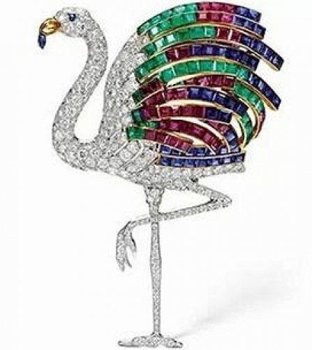 苏富比温莎公爵夫人的一系列的首饰,被誉为传奇!这一些列中,包括卡地亚1940年的火烈鸟胸针,上面覆盖着许多红宝石、蓝宝石、祖母绿、黄水晶和钻石。爱德华八世对心爱的女人无比阔绰,尽管他不希望爱人死后卖掉这些珠宝,但在这些珠宝的价值却直线上升,拍卖出的价格整整高了7倍!