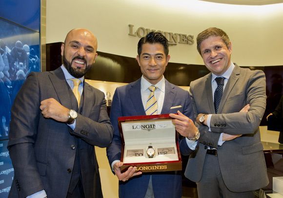 浪琴表國際形象大使郭富城和浪琴国际营销主管副总裁胡安 .卡洛斯·卡佩里先生及浪琴表中东区域品牌经理帕特里克·奥恩先生戴上了浪琴经典征服者月相表第20版限量版手錶,特別吸睛。這款月相表顯示出了玫瑰金计时码表的精緻,與宇宙恆星的卓越與優雅相呼應。